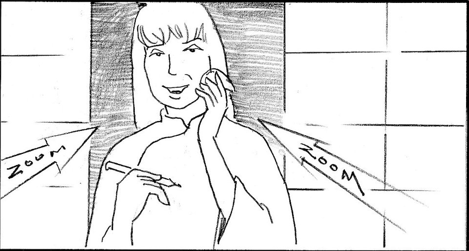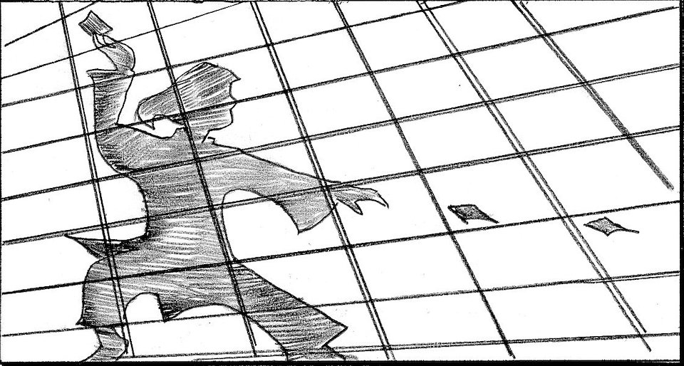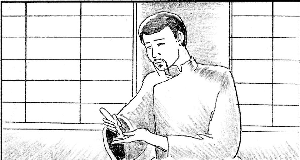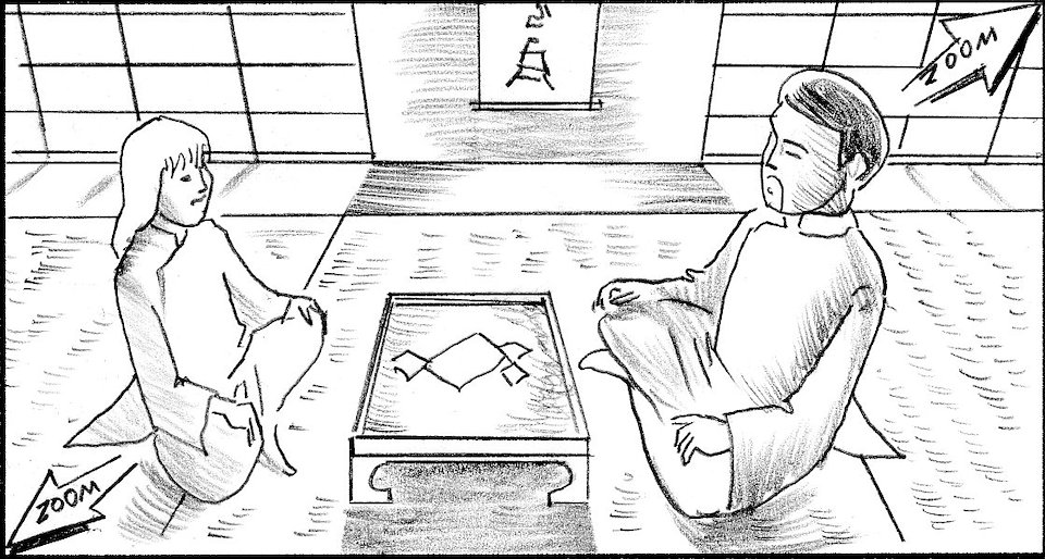 Cut to girl's shadow seen through soji screen.