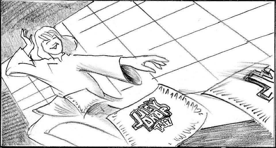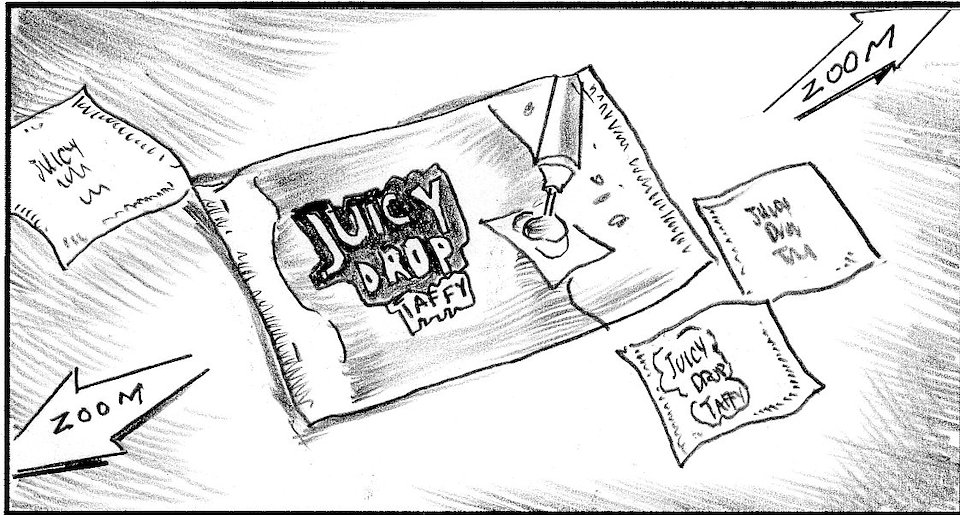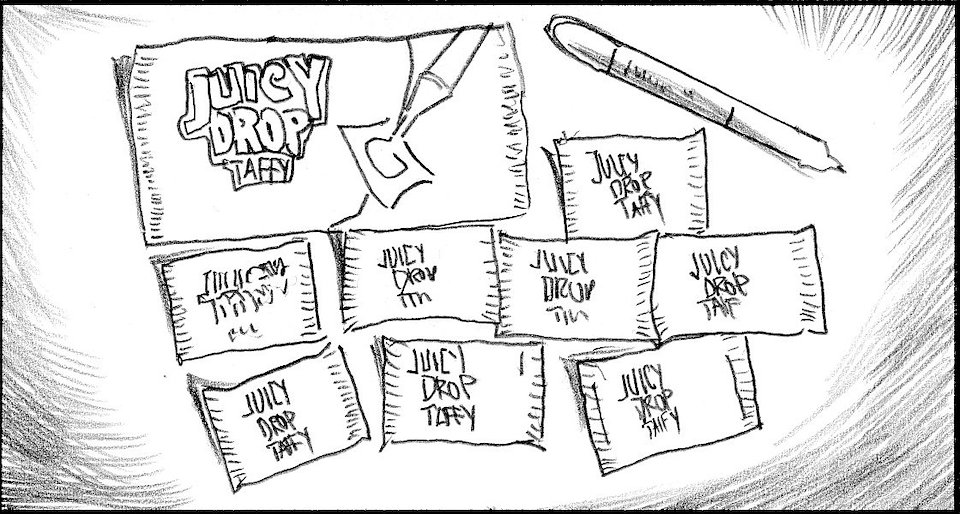 Like throwing stars, she throws Juicy taffy packs toward camera.