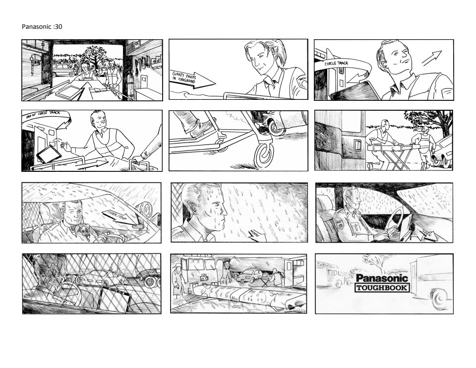 JMills Entertainment produced a package of videos for Panasonic ToughBook. They needed precise Pre-visualization. We created boards incorporating casting and location photos to render the shots.